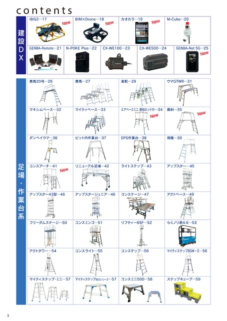 GENBA-Remote…21N-POKEPlus…22CX-WE100…23CX-WE500…24GENBA-Net5G…25勇馬20号…26勇馬…27楽駝…29ウマGTWR…31Nweマキシムベース…32マイティベース…33エアベースミニ感知ロッド付…34weN勇斜…35weNダンペイウマ…36ピット内作業台…37EPS作業台…38飛龍…39コンスアーチ…41weNリニューアル足場…42ライトステップ…43アップスター…45アップスター43型…46アップスタージュニア…46コンステージ…47アクトベース…49フリーダムステージ…50コンスミンゴ…51リフティー65F…52らくノリ君4.6…53アクトタワー…54コンスライト…55コンステップ…56マイティステップBSM-Ⅱ…56マイティステップ・ミニ…57マイティステップBSSシリーズ…57コンスミニ500…58ステップキューブ…59建設DX足場・作業台系5contentsIBIS2…17weNBIM×Drone…18weNカオカラ…19weNM-Cube…20