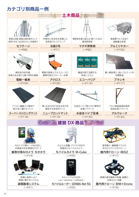 カテゴリ別商品一例土木商品表面は歩廊、裏面は傾斜梯子として使用できる1台2役のアルミ歩廊梯子セフテージ(→P68)作業性と安全性を考慮した障害物を乗り越える(跨ぐ)ための多用途アルミタラップ法面2号(→P71)専用昇降具マタギ昇降具(→P82)高強度アルミ合金で超軽量を実現アルミリヤカー(→P103)傾斜地や砂利道、段差のある道でも軽々荷物を運搬悪路や鉄筋上でもスムーズに運搬可能なクローラー台車電動一輪車(→P104)アクロス(→P105)騒音対策で活躍する吸音システムエコーバリア(→P116)重い敷鉄板と、弱いゴムマットの中間商品プラシキ(→P117)ナイロン繊維入り素材で耐久性に優れたマット滑り止め付きで安全な歩行を水抜きパイプ取り付け専用の確保する多目的マット足場ブラケットアルミ製垂直傾斜面用仮設足場ブラケットスーパーストロングマットニュープロットマット水抜きパイプ足場(→P118)(→P119)(→P133)アルウォーク(→P134)建設DX商品AIカメラで顔データを分析し、作業員の安全管理をサポートかんたん設置・クラウド対応の現場向けモバイルカメラ暑熱対策AIカメラカオカラモバイルカメラM-Cube(→P19)(→P20)業界最小・最軽量クラスの手のひらサイズのドローン屋内用ドローンIBIS2(→P17)映像と音声により現場と繋がるシステム遠隔臨場システム(→P21)3キャリア&5G対応(au/docomo/softbank)現場の進捗確認や設備・装置の点検などに活躍モバイルルーターGENBA-Net5G屋内用ドローンBIM×Drone(→P25)(→P18)11