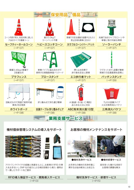 保安用品・備品コーン内部が見え、防犯対策に適した穴あきタイプの重量コーン重さ3.0kgでコーンベット不要現場での安全通路の設置や立ち入り先端穴あきタイプのコーンや禁止区域を簡単に区分け単管に取付可能な照明セーフティーホールコーンヘビースコッチコーンカラフルコーン/バー/ベット(→P137)(→P137)(→P137)ソーラーパンチ(→P137)重量3.45kgと軽量で2段重ね可単管パイプと組み合わせて使用する樹脂製単管バリケードプラフェンス(→P137)ブロースタンド(→P137)滑り止め効果で歩行者を安全に誘導エコ歩行者マット(→P137)マグネット式で、設置が簡単現場での区画整理を容易にパッチンスタンド(→P139)回転式なので両面で使用可能折り畳み式で持ち運び簡単A(普通)・B(油)・C(電気)あらゆる火災に対応無地/月日程表ホワイトボード(→P138)会議テーブル/折り畳みチェアABC粉末消火器10型(→P138)(→P138)業務支援サービス7Lの大容量タイプ火災対策用消火バケツ三角消火バケツ(→P138)機材個体管理システムの導入をサポートお客様の機材メンテナンスをサポートアクトワンヤマイチの経験と実績をもとに、お客様のRFIDの導入をお手伝いしDNP社の協力による検討段階から導入・運用まで一貫したサポートをご提供●機材洗浄サービス●機材修理サービスお手持ちの機材の洗浄作業に関するお悩み解決にお役立ち長年培った確かな技術でお客様の課題を解決RFID導入検証サービス・開発導入サービス機材洗浄サービス・修理サービス(→P13)(→P15)12