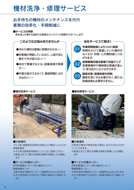 機材洗浄・修理サービスお手持ちの機材のメンテナンスを代行業務の効率化・手間削減に■サービスの特徴長年培った確かな技術でお客様のメンテナンス業務をサポートしますこのようなお悩みありませんか●汚れた機材の整備に時間がかかる・・・●未整備が滞留しているのに、人員不足と繁忙で手が回らない・・・●自社で整備するには、設備投資が高額だ・・・●作業の音がうるさくて、騒音問題になりかねない・・・当社サービスで解決!作業時間削減によりコスト削減時間をかけて整備していた機材がなくなり、手間・人件費削減につながります。高稼働機材優先整備で収益アップ高稼働機材や機械類の整備が進んで、受注拡大にもつながります。騒音対策・設備投資を抑制騒音を気にする必要がなく、新たな設備投資も必要ありません。010203■機材洗浄サービス■機材修理サービス■対象機材アルミ製・鋼製軽仮設資材全般および養生くんなどの樹脂製敷板※その他お客様保有機材についてはご相談ください※製品化までに要する時間は時期や数量により変動します■対象機材お客様の機材が実施可能か事前にお打ち合わせさせていただきます。※製品化までに要する時間は時期や数量により変動します■サービス対象センター岸和田整備センター/掛川機材センター/関東整備センター※弊社指定の機材センターへ直接持ち込みとなります※その他地域での対応をご希望の場合はご相談ください■サービス対象センター岸和田整備センター/掛川機材センター/関東整備センター※弊社指定の機材センターへ直接持ち込みとなります※その他地域での対応をご希望の場合はご相談ください15