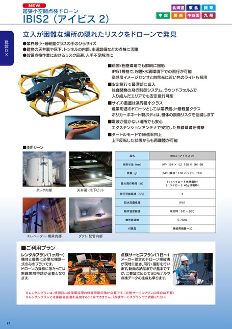 NEW超狭小空間点検ドローンIBIS2(アイビス2)北海道東北関東中部関西中四国九州立入が困難な場所の隠れたリスクをドローンで発見●業界最小・最軽量クラスの手のひらサイズ●建物の天井裏や床下、トンネルの内部、水道設備などの点検に活躍●設備点検作業におけるリスク回避、人手不足解消に■暗闇/粉塵環境でも鮮明に撮影IP51規格で、粉塵・水滴環境下での飛行が可能高感度イメージセンサと自然光に近い色のライトも採用■安定飛行で最深部に進入独自開発の飛行制御システム、ラウンドフォルムで入り組んだエリアでも安定飛行可能■サイズ・重量は業界最小クラス産業用途のドローンとしては業界最小・最軽量クラスポリカーボネート製ボディは、機体の損傷リスクを低減します■電波が届かない場所でも安心エクステンションアンテナで安定した無線環境を構築■タートルモードで帰還率向上上下反転した状態からも再離陸が可能品名IBIS2(アイビス2)外形寸法(mm)(W)194×(L)198×(H)58質量(g)243(機体:150バッテリ:93)最大飛行時間(分)飛行可能風速(m/s)防水防塵性能動作温度範囲動作周波数付属品11(ペイロード未搭載時)9(ペイロード40g搭載時)3IP51飛行時:5℃~60℃5.7GHz操縦用機器一式■使用シーンタンク内部天井裏・地下ピットエレベーター・橋梁内部ダクト・配管内部■ご利用プランレンタルプラン(1ヶ月~)機体と撮影に必要な機器一式のみのプランです。ドローンの操作にあたっては無線開局申請が必要となります。点検サービスプラン(1日~)メーカー認定のドローン操縦者が現地に赴き、飛行・撮影を行います。動画の納品までが基本ですが、ご要望に応じて3Dモデルや点検データの生成も承ります。※レンタルプランは、使用前に映像電波用の無線開局申請が必要です。点検サービスプランの場合は不要)※レンタルプランには操縦者派遣を追加することはできません。点検サービスプランでご依頼ください)17