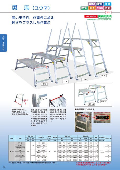 勇馬(ユウマ)高い安全性、作業性に加え軽さをプラスした作業台北海道東北関東中部関西中四国九州認定機番管理商品NETIS登録商品CG-200021-VE※NETIS対象:セーフティガード付14号・18号11号14号7号18号72.5°階段枠下端幅が広く、昇降角度72.5°と、側方・桁側の転倒を抑止。踏桟と支柱を2×2箇所で固定する合体型ブラケットはセミチューブラリベットとの組合せで階段枠の剛性を高め、ひねりやガタつきを抑止。耐久性アップを実現。天板両端(妻側)に警告色の赤を採用した滑り止めモールを敷設。滑り止め効果を施した大口径バーリングデザイン。11号-S7号-S■機番管理しております品名型式7号-S11号-S11号-S手掛り4本付勇馬7号11号500505~693765724~1,084724~1,084505~693724~1,084206011号手掛り4本付1,545724~1,08414号18号1,057~1,4171,390~1,750※11号手掛り4本付、11号-S手掛り4本付は仮設工業会の認定ではありません。27天板寸法幅mm長さmm天板高さ伸縮ピッチ踏桟幅mmmmmm幅mm長さmm設置寸法収納寸法653~7021,221~1,339709~8021,359~1,586709~8021,359~1,586653~7022,001~2,119709~8022,139~2,366709~8022,139~2,366795~8832,349~2,576881~9732,559~2,786幅mm650710774650710774860880長さmm9249209201,6901,6901,6901,7101,710高さmm220220220170170170240270質量許容荷重kgkN(kgf)手掛り棒10.611.914.713.516.219.021.423.31.47(150)――4――444※北海道・東北営業部は7号-S、11号-Sのみ取扱い※中部地区は7号、7号-S、11号-Sのみ取扱い