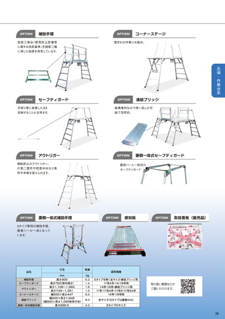 OPTION補助手摺仮設工業会「墜落防止設備等に関する技術基準」手摺第二種に準じた強度を保有しています。OPTIONコーナーステージ壁ぎわの作業にお勧め。OPTIONセーフティガード手掛り棒に装着したまま収納することが出来ます。OPTION連結ブリッジ縦横兼用なので使い回しが可能で効率的。OPTIONアウトリガー横転防止のアウトリガー。片面二箇所や両面中央など場所や本数を変えられます。OPTION妻側一体式セーフティガード妻側バーと一体式のセーフティガードOPTION妻側一体式補助手摺OPTION感知板OPTION取扱看板(販売品)Sタイプ専用の補助手摺。妻側バーが一体となっています。品名補助手摺セーフティガードアウトリガーコーナーステージ連結ブリッジ妻側一体式補助手摺寸法mm高さ900高さ750(取付高さ)長さ1,108〜1,983長さ749〜1,261幅500×長さ447幅500×長さ1,648(幅500×長さ1,595有効寸法)高さ899.5質量kg5.21.41.81.56.28.34.2適用機種Sタイプを除く全サイズ・連結ブリッジ用11号4手・14・18号用14号・18号・連結ブリッジ用11号・11号4手・11号S・11号S4手14号・18号用取り扱い動画などがご覧いただけます。全サイズ(Sタイプは妻側のみ)Sタイプのサイズ28