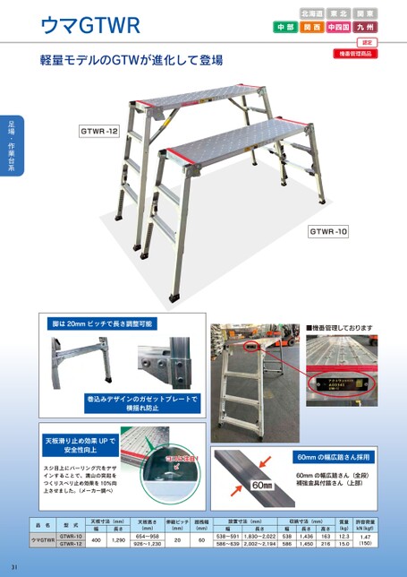 ウマGTWR軽量モデルのGTWが進化して登場北海道東北関東中部関西中四国九州認定機番管理商品GTWR-12GTWR-10脚は20mmピッチで長さ調整可能■機番管理しております巻込みデザインのガゼットプレートで横揺れ防止天板滑り止め効果UPで安全性向上スジ目上にバーリング穴をデザインすることで、溝山の突起をつくりスベリ止め効果を10%向上させました。(メーカー調べ)60mmの幅広踏さん採用60mmの幅広踏さん(全段)補強金具付踏さん(上部)品名型式ウマGTWRGTWR-10GTWR-12天板寸法(mm)幅長さ4001,290天板高さ(mm)伸縮ピッチ(mm)踏桟幅(mm)設置寸法(mm)長さ幅654~958926~1,2302060538~591586~6391,830~2,0222,002~2,194収納寸法(mm)幅538586長さ1,4361,450高さ163216質量(kg)許容荷量kN(kgf)12.315.01.47(150)31