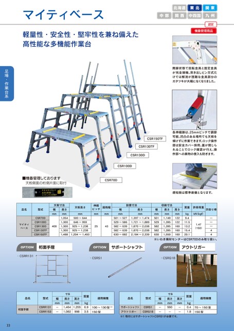 マイティベース軽量性・安全性・堅牢性を兼ね備えた高性能な多機能作業台北海道東北関東中部関西中四国九州認定機番管理商品開脚状態で回転金具と固定金具が完全接触。突き出しピン方式だけでは解消が困難な金具部分のガタツキが大幅になくなりました。各伸縮脚は、25mmピッチで調節可能。凹凸のある場所でも天板を傾けずに作業できます。ロック操作部は安全カバー採用。蓋が閉じられることでロック確認が行え、操作部への異物の侵入も防ぎます。CSR150TFCSR130TFCSR130DCSR100D■機番管理しております天板側面の桁側片面に取付CSR70D品名型式天板寸法幅mm長さmm天板高さ伸縮ピッチ踏桟幅mmmmmm幅mmマイティベースCSR70DCSR100DCSR130DCSR130TFCSR150TF4001,0541,3001,3001,3001,488500~644646~959925~1,238925~1,2381,204~1,493501~5271,397~1,474529~5861,721~1,8892543582~6391,870~2,038582~6391,870~2,038630~6822,184~2,339設置寸法収納寸法長さmm感知板は標準装備となります。幅mm501529582582630長さmm1,1491,3951,3951,3951,559高さmm122122160160160質量許容荷重手掛り棒kN(kgf)1.47(150)kg9.411.513.215.420.1―――44OPTION桁面手摺OPTIONサポートシャフトOPTIONアウトリガー・CSRR131・CSRS1・CSRG18※いわき機材センターはCSR70Dのみ取り扱い。品名型式桁面手摺CSRR131CSRR153寸法長さmm1,4641,082高さmm1,255998質量kg6.93.5幅mm——33適用機種品名型式幅mm100~130型※1150型サポートシャフトアウトリガー※1取付にはサポートシャフトCSRS1が必要です。CSRS1CSRG18——寸法長さmm560—高さmm——質量kg0.41.8適用機種70~150型150型
