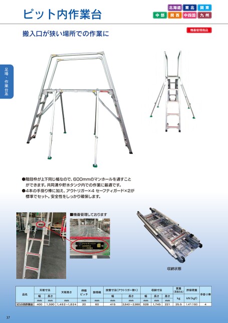 ピット内作業台搬入口が狭い場所での作業に北海道東北関東中部関西中四国九州機番管理商品●階段枠が上下同じ幅なので、600mmのマンホールを通すことができます。共同溝や貯水タンク内での作業に最適です。●4本の手掛り棒に加え、アウトリガー×4セーフティガード×2が標準でセット。安全性をしっかり確保します。■機番管理しております収納状態伸縮ピッチmm20踏桟幅mm60設置寸法(アウトリガー除く)収納寸法幅mm415長さmm2,640~2,868幅mm528長さmm1,745高さmm221質量(本体のみ)許容荷重kgkN(kgf)手掛り棒25.51.47(150)4天板寸法長さmm天板高さmm品名ピット内作業台幅mm400371,5901,462~1,824