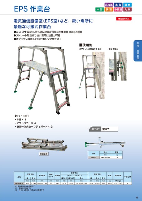 EPS作業台電気通信設備室(EPS室)など、狭い場所に最適な可搬式作業台●コンパクト設計で、持ち運び設置が可能な本体重量16kgと軽量●ストレート階段枠で狭い場所に設置が可能●オプションの壁当てを取付け、安全性が向上北海道東北関東中部関西中四国九州機番管理商品■使用例オプションの壁当てを使用壁当て拡大【セット内容】・本体×1・アウトリガー×4・妻側一体式セーフティガード×2収納状態天板高さ伸縮ピッチ品名天板寸法長さmm幅mm4001,290EPS作業台※上記は本体のみの数値です※1階段枠の数値です※2手がかり棒(外-外)を含んだ数値ですOPTION壁当て品名長さmm壁当て543~699質量kg1.3踏桟幅(アウトリガー除く)設置寸法収納寸法mm790~1,150mm20mm60mm415mm528幅(※1)幅(※2)長さmm1,916~2,143幅mm528長さmm1,442高さmm213質量許容荷重手掛り棒kgkN(kgf)15.91.47(150)438