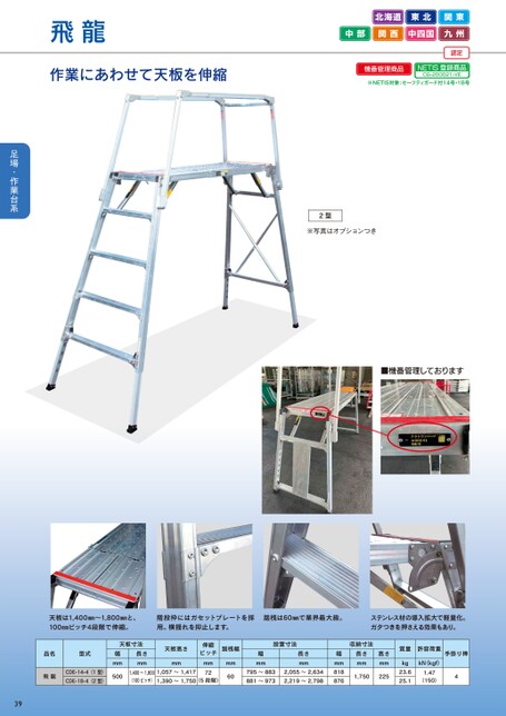 飛龍作業にあわせて天板を伸縮北海道東北関東中部関西中四国九州認定機番管理商品NETIS登録商品CG-200021-VE※NETIS対象:セーフティガード付14号・18号2型※写真はオプションつき■機番管理しております天板は1,400㎜~1,800㎜と、100㎜ピッチ4段階で伸縮。階段枠にはガセットプレートを採用。横揺れを抑止します。踏桟は60㎜で業界最大級。ステンレス材の導入拡大で軽量化。ガタつきを押さえる効果もあり。品名型式飛龍CDE-14-4(1型)CDE-18-4(2型)天板寸法幅mm500長さmm1,400~1,800(100ピッチ)天板高さmm1,057~1,417伸縮ピッチmm721,390~1,750(5段階)踏桟幅mm60設置寸法幅mm長さmm795~8832,055~2,634881~9732,219~2,798収納寸法長さmm高さmm1,750225幅mm818876質量許容荷重kg23.625.1kN(kgf)1.47(150)手掛り棒439