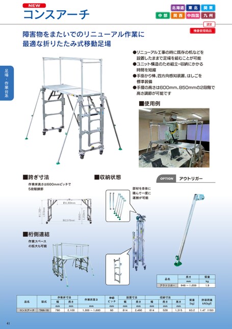 NEWコンスアーチ障害物をまたいでのリニューアル作業に最適な折りたたみ式移動足場北海道東北関東中部関西中四国九州認定機番管理商品●リニューアル工事の時に既存の机などを設置したままで足場を組むことが可能●ユニット構造のため組立・収納にかかる時間を短縮●手掛かり棒、四方向感知装置、はしごを標準装備●手摺の高さは600mm、850mmの2段階で高さ調節が可能です■使用例■跨ぎ寸法作業床高さは600mmピッチで5段階調節■収納状態OPTIONアウトリガー部材を本体に積んで一度に運搬が可能■桁側連結作業スペースの拡大も可能品名長さmmアウトリガー948~1,659質量kg1.9品名型式コンスアーチTAN-16作業床寸法幅mm780長さmm2,100作業床高さmm1,300~1,600伸縮ピッチmm60設置寸法幅mm814長さmm2,490収納寸法長さmm528高さmm1,315幅mm814質量(kg)許容荷重kN(kgf)63.21.47(150)41