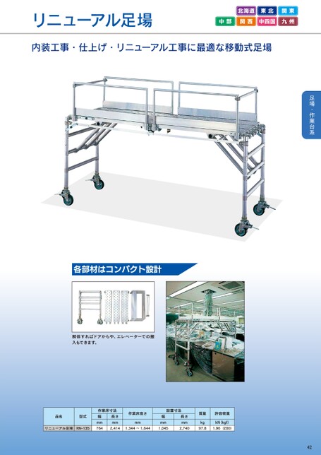 リニューアル足場北海道東北関東中部関西中四国九州内装工事・仕上げ・リニューアル工事に最適な移動式足場各部材はコンパクト設計解体すればドアからや、エレベーターでの搬入もできます。品名型式作業床寸法幅mm長さmm作業床高さmm幅mmリニューアル足場RN-1357642,4141,344~1,6441,045設置寸法長さmm2,740質量kg97.8許容荷重kN(kgf)1.96(200)42