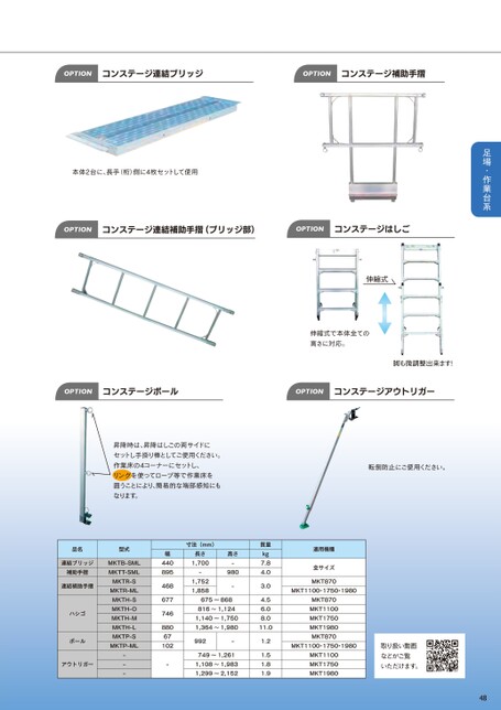 OPTIONコンステージ連結ブリッジOPTIONコンステージ補助手摺本体2台に、長手(桁)側に4枚セットして使用OPTIONコンステージ連結補助手摺(ブリッジ部)OPTIONコンステージはしご伸縮式で本体全ての高さに対応。OPTIONコンステージポールOPTIONコンステージアウトリガー昇降時は、昇降はしごの両サイドにセットし手掛り棒としてご使用ください。作業床の4コーナーにセットし、リングを使ってロープ等で作業床を囲うことにより、簡易的な端部感知にもなります。転倒防止にご使用ください。品名型式連結ブリッジ補助手摺連結補助手摺ハシゴポールアウトリガーMKTB-SMLMKTT-SMLMKTR-SMKTR-MLMKTH-SMKTH-OMKTH-MMKTH-LMKTP-SMKTP-ML---幅44089546867774688067102-寸法(mm)長さ1,700-1,7521,858高さ-980-675~868816~1,1241,140~1,7501,364~1,980992-749~1,2611,108~1,9831,299~2,152質量kg7.84.03.04.56.08.011.01.21.51.81.9適用機種全サイズMKT870MKT1100・1750・1980MKT870MKT1100MKT1750MKT1980MKT870MKT1100・1750・1980MKT1100MKT1750MKT1980取り扱い動画などがご覧いただけます。48