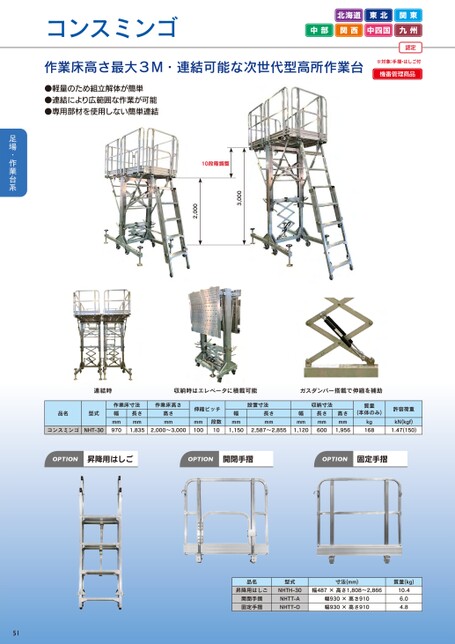 コンスミンゴ北海道東北関東中部関西中四国九州作業床高さ最大3M・連結可能な次世代型高所作業台認定※対象:手摺・はしご付機番管理商品●軽量のため組立解体が簡単●連結により広範囲な作業が可能●専用部材を使用しない簡単連結10段階調整3,0002,000連結時収納時はエレベータに積載可能ガスダンパー搭載で伸縮を補助品名型式コンスミンゴNHT-30作業床寸法幅mm970長さmm1,835作業床高さ高さmm2,000~3,000伸縮ピッチmm100段数10設置寸法収納寸法幅mm長さmm幅mm1,1502,587~2,8551,120長さmm600高さmm1,956質量(本体のみ)kg168許容荷重kN(kgf)1.47(150)OPTION昇降用はしごOPTION開閉手摺OPTION固定手摺品名昇降用はしご開閉手摺固定手摺型式NHTH-30NHTT-ANHTT-O寸法(mm)質量(kg)幅487×高さ1,808~2,866幅930×高さ910幅930×高さ91010.46.04.851