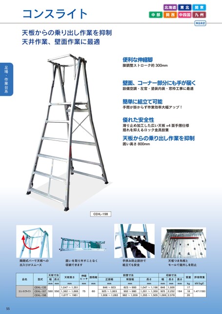 コンスライト天板からの乗り出し作業を抑制天井作業、壁面作業に最適北海道東北関東中部関西中四国九州単品承認便利な伸縮脚脚調整ストローク約300mm壁面、コーナー部分にも手が届く設備空調・左官・塗装内装・窓枠工事に最適簡単に組立て可能手間が掛からず作業効率大幅アップ!優れた安全性滑り止め加工した広い天板+4面手摺仕様揺れを抑えるロック金具設置天板からの乗り出し作業を抑制囲い高さ800mmCEHL-198開閉式バーで天板への出入りがスムーズ囲いを取り外すことなく収納できます手挟み防止設計で組立ても安全天板つま先板とモールで踏外しを防止品名型式天板寸法長さ幅mmmm天板高さ伸縮ピッチ踏桟幅mmmmmm正面幅mm設置寸法背面幅mm長さmmCEHL-1351,047~1,351846~923823~9001,047~1,196コンスライトCEHL-1675005501,362~1,6667560925~1,003902~9801,201~1,350収納寸法幅mm846925長さmm1,9262,252高さmm164CEHL-1981,677~19811,006~1,083982~1,0591,355~1,5051,0062,578質量許容荷重kN(kgf)1.47(150)kg17182055