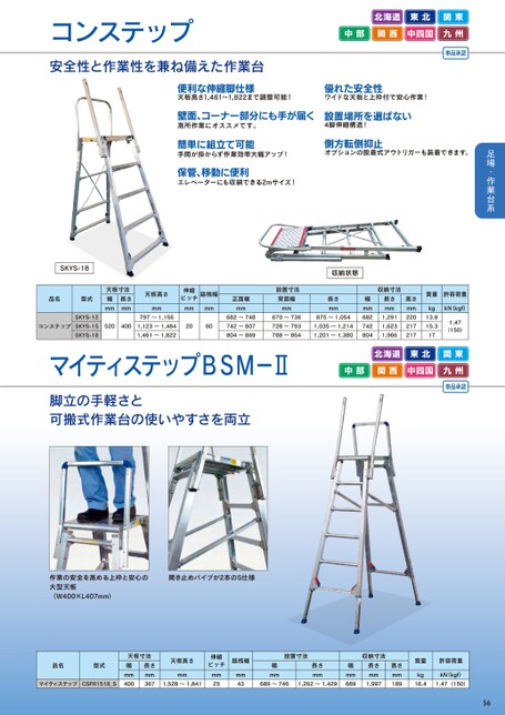 コンステップ安全性と作業性を兼ね備えた作業台北海道東北関東中部関西中四国九州単品承認便利な伸縮脚仕様天板高さ1,461~1,822まで調整可能!優れた安全性ワイドな天板と上枠付で安心作業!壁面、コーナー部分にも手が届く高所作業にオススメです。設置場所を選ばない4脚伸縮構造!簡単に組立て可能手間が掛からず作業効率大幅アップ!保管、移動に便利エレベーターにも収納できる2mサイズ!側方転倒抑止オプションの脱着式アウトリガーも装着できます。SKYS-18収納状態品名型式天板寸法幅mm長さmm天板高さ伸縮ピッチ踏桟幅mmmmmmSKYS-12797~1,156コンステップSKYS-155204001,123~1,4842060SKYS-181,461~1,822正面幅mm682~748742~807804~869設置寸法背面幅mm670~736728~793788~854長さmm875~1,0541,035~1,2141,201~1,380収納寸法長さmm1,2911,6231,966高さmm220217217幅mm682742804質量許容荷重kg13.815.317kN(kgf)1.47(150)マイティステップBSM-Ⅱ脚立の手軽さと可搬式作業台の使いやすさを両立北海道東北関東中部関西中四国九州単品承認作業の安全を高める上枠と安心の大型天板(W400×L407mm)開き止めパイプが2本のS仕様品名型式天板寸法幅mm長さmm天板高さmmマイティステップCSFR1518_S4003671,528~1,841伸縮ピッチmm25踏桟幅mm43設置寸法幅mm長さmm689~7461,262~1,429収納寸法幅mm689長さmm1,997高さmm189質量許容荷重kgkN(kgf)16.41.47(150)56