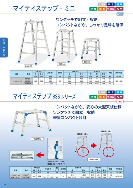 マイティステップ・ミニ北海道東北関東中部関西中四国九州単品承認ワンタッチで組立・収納。コンパクトながら、しっかり足場を確保BSR120BSR90BSR60品名型式マイティステップ・ミニBSR60BSR90BSR120天板寸法幅mm長さmm400305天板高さ踏桟幅mm5958951,195mm53幅mm515569624設置寸法長さmm7058661,027収納寸法長さmm9711,2821,593高さmm140145151幅mm515569624質量許容荷重kN(kgf)1.56(160)kg6.07.49.8マイティステップBSSシリーズ北海道東北関東中部関西中四国九州認定コンパクトながら、安心の大型天板仕様ワンタッチで組立・収納軽量コンパクト設計BSSF6W伸縮脚最小伸縮脚最大片手で持ち運びできる軽量&コンパクトサイズBSS120W品名型式マイティステップBSSシリーズBSSF6WBSS120W天板寸法幅mm長さmm500600天板高さmm600923~1,236伸縮ピッチ踏桟幅mm―25mm43設置寸法幅mm616長さmm1,033680~7371,201~1,368収納寸法幅mm616680長さmm1,3011,635高さmm130128質量kg8.213.1許容荷重kN(kgf)1.47(150)57