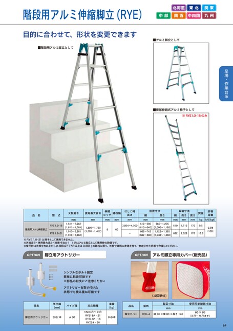 階段用アルミ伸縮脚立(RYE)北海道東北関東中部関西中四国九州目的に合わせて、形状を変更できます■アルミ脚立として■階段用アルミ脚立として■脚部伸縮式アルミ梯子として※RYE1.0-18のみ品名型式天板高さ使用最大高さ伸縮ピッチ踏桟幅mmmmmmmm階段用アルミ伸縮脚立RYE1.0-18RYE1.0-211,611~2,062(1,611~1,764)1,910~2,361(1,910~2,062)1,309~1,760(1,309~1,462)660はしご時長さmm3,064~4,000-設置寸法幅mm長さmm収納寸法幅mm長さmm高さmm質量許容荷重kgkN(kgf)610~690(610~640)662~742(662~690)965~1,205(1,060~1,160)1,122~1,365(1,230~1,330)6101,7151709.56622,02317010.60.98(100)※RYE1.0-21は梯子として使用できません。※天板高さ・使用最大高さ・設置寸法の()内はアルミ脚立として使用時の数値です。※使用時は天板を含め上から2段目以下(7尺以上は3段目)の踏桟に乗り、天板や踏桟に身体を当て、安定させた状態で作業してください。OPTION脚立用アウトリガーOPTIONアルミ脚立専用カバー(販売品)シンプルなボルト固定簡単に脱着可能です※部品の紛失にご注意くださいアウトリガーを取り付けた状態でも積み重ね可能です(4個単位)品名張出幅(mm)パイプ径対応機種脚立用アウトリガー202/本φ30TAK3尺~9尺RYE18A・21RYZL12・18RYZ24・30重量(kg)0.6/本品名型式製品寸法mm脚立カバーRCK-4縦70×横80×高さ140使用可能脚部寸法mm60×80(3尺~9尺まで)64