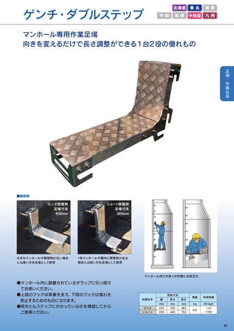 ゲンチ・ダブルステップ北海道東北関東中部関西中四国九州マンホール専用作業足場向きを変えるだけで長さ調整ができる1台2役の優れもの■使用例ロング設置例足場寸法630mmショート設置例足場寸法360mm大きなマンホールや障害物がない場合には長い方を足場として使用1号マンホールや槽内に障害物がある場合には短い方を足場として使用●マンホール内に設置されているタラップに引っ掛けてお使いください。●上段のフックは荷重を支え、下段のフックは揺れを防止するためのものになります。●両方ともステップにかかっているのを確認してからご使用ください。マンホール内での多くの作業にお役立ち設置向きロングショート収納寸法長さmm753483高さmm483753幅mm220220質量許容荷重kg8.0kN(kgf)1.47(150)66