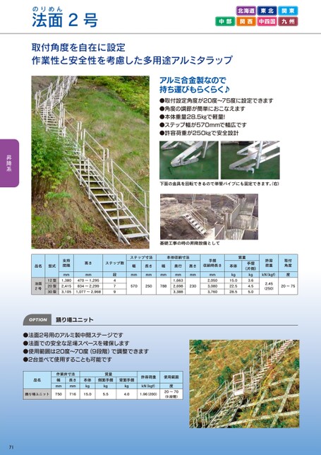 北海道東北関東中部関西中四国九州面2号りめん法の取付角度を自在に設定作業性と安全性を考慮した多用途アルミタラップアルミ合金製なので持ち運びもらくらく♪●取付設定角度が20度~75度に設定できます●角度の調節が簡単におこなえます●本体重量28.5㎏で軽量!●ステップ幅が570mmで幅広です●許容荷重が250㎏で安全設計下面の金具を回転できるので単管パイプにも固定できます。右)基礎工事の時の昇降設備として品名型式法面2号12型20型30型支持間隔mm1,3802,4153,105高さmm470~1,295834~2,2991,077~2,968ステップ数段479ステップ寸法本体収納寸法手摺幅mm長さmm幅mm570250788奥行高さ収納時長さmm230mm1,6632,6983,388mm2,0503,0803,760質量手摺(片側)kg3.64.55.0本体kg15.022.528.5許容荷重取付角度kN(kgf)度2.45(250)20~75OPTION踊り場ユニット●法面2号用のアルミ製中間ステージです●法面での安全な足場スペースを確保します●使用範囲は20度~70度(9段階)で調整できます●2台並べて使用することも可能です品名作業床寸法幅mm長さmm踊り場ユニット750716質量側面手摺kg5.5本体kg15.0背面手摺kg4.0許容荷重使用範囲kN(kgf)度1.96(200)20~70(9段階)71