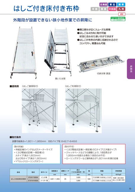 はしご付き床付き布枠北海道東北関東中部関西中四国九州外階段が設置できない狭小地作業での昇降に認定NETIS登録商品KK-180006-A●開口部分が広くスムーズな昇降●はしごは4方向に取付可能コンパクト。積重ねも可能状況に合わせた使い方ができます●はしごが布枠の内部に収納されるので開いた状態収納状態裏面■使用例(はしご妻側取付)(はしご桁側取付)■取付条件設置可能高さ=1,601~1,955mm対応パイプ径Φ42.7・Φ48.6(取付可能)◦枠組足場のインチおよびメーターサイズ◦くさび緊結式足場(一側足場)のAタイプ(高さ1,800mm)およびBタイプ(高さ1,900mm)◦YTロック(ローリングタワー)(取付不可)◦くさび緊結式足場(一側足場)のCタイプ(三共製タイプ)◦ジャッキベースなどでの調整により、1段目高さが1,955mmを超える場合(1段目のみ不可)◦ローリングタワーなど建枠高さが1,601mm未満の足場品名型式枠サイズ設置高さ調整ピッチ長さ(つかみ金具芯‐芯)はしご付き床付き布枠STJR-F1850Aインチ用STJR-M1850Aメーター用mm1,601~1,955mm25mm1,8291,800幅mm500質量kg許容荷重kN(kgf)17.8布枠14.6/はしご3.2)17.7布枠14.5/はしご3.2)布枠1.96(200)はしご0.98(100)72