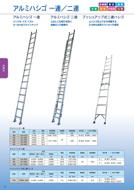 アルミハシゴ一連/二連北海道東北関東中部関西中四国九州アルミハシゴ一連シンプルイズベスト2~6mまでラインナップアルミハシゴ二連上はしごの抜けを防ぐ自動ロック装置付プッシュアップ式二連ハシゴ上ハシゴを上下させ伸縮する2カ所の金具でワンタッチ固定アルミハシゴ一連品名2M3M4M5M6M型式JXV-21SGX-30SGX-40SGX-50SGX-60Sアルミハシゴ二連全長mm2,1303,0704,0605,0506,040質量kg4.36.88.810.712.5許容荷重kN(kgf)0.98(100)1.27(130)踏桟幅mm42踏桟間隔梯子幅()内は下端部mm345330mm外407内353(430)外405内351(448)品名6M8M10M全長使用長さ(最小~最大)型式mmGX-60DGX-80DGX-100D4,076~6,0565,066~8,0366,056~10,016プッシュアップ式二連ハシゴ品名型式全長使用長さ(最小~最大)mm2M2SWA-40B2,455~4,030収納時mm3,8864,8765,866収納時mm2,292質量kg16.320.824.7質量kg7.4許容荷重踏桟幅踏桟間隔梯子幅()内は下端部kN(kgf)1.27(130)1.07(110)0.98(100)mm42mm330mm上下外387内332外405内351(448)許容荷重踏桟幅踏桟間隔梯子幅()内は下端部kN(kgf)0.98(100)mm42mm315mm上下外359内311外359内311(377)73