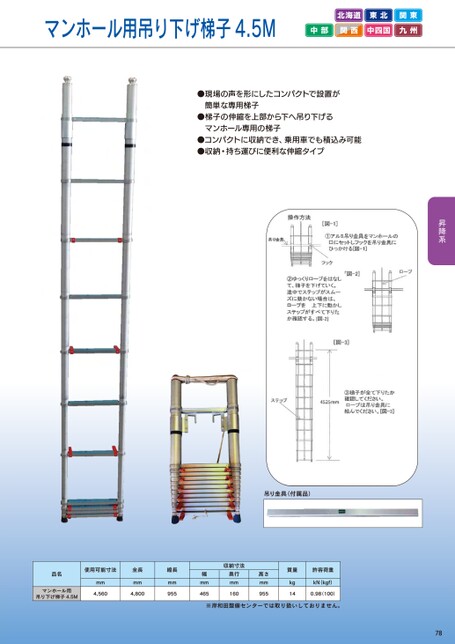 マンホール用吊り下げ梯子4.5M北海道東北関東中部関西中四国九州●現場の声を形にしたコンパクトで設置が簡単な専用梯子●梯子の伸縮を上部から下へ吊り下げるマンホール専用の梯子●コンパクトに収納でき、乗用車でも積込み可能●収納・持ち運びに便利な伸縮タイプ吊り金具(付属品)品名使用可能寸法マンホール用吊り下げ梯子4.5Mmm4,560全長mm4,800縮長mm955収納寸法奥行mm160高さmm955幅mm465質量許容荷重kg14kN(kgf)0.98(100)※岸和田整備センターでは取り扱いしておりません。78