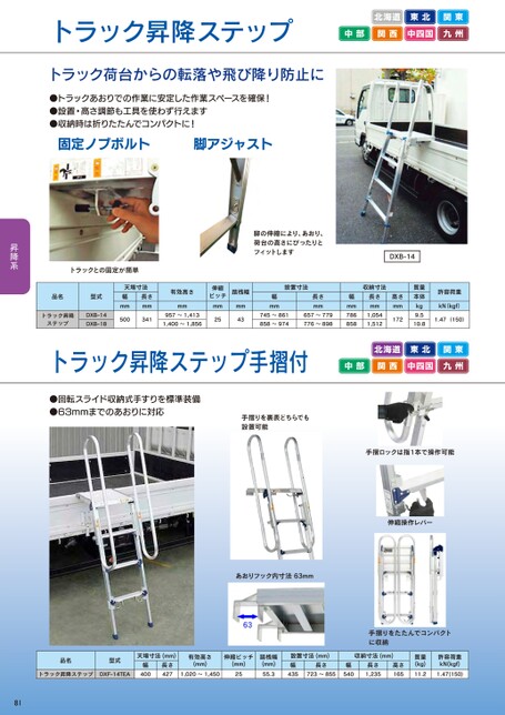 トラック昇降ステップ北海道東北関東中部関西中四国九州トラック荷台からの転落や飛び降り防止に●トラックあおりでの作業に安定した作業スペースを確保!●設置・高さ調節も工具を使わず行えます●収納時は折りたたんでコンパクトに!固定ノブボルト脚アジャスト脚の伸縮により、あおり、荷台の高さにぴったりとフィットしますDXB-14トラックとの固定が簡単品名型式トラック昇降ステップDXB-14DXB-18天場寸法幅mm長さmm500341有効高さmm957~1,4131,400~1,856伸縮ピッチ踏桟幅mm25mm43設置寸法幅mm長さmm745~861858~974657~779776~898収納寸法長さmm1,0541,512幅mm786858高さmm172質量本体kg9.510.8許容荷重kN(kgf)1.47(150)トラック昇降ステップ手摺付北海道東北関東中部関西中四国九州●回転スライド収納式手すりを標準装備●63mmまでのあおりに対応手摺りを裏表どちらでも設置可能手摺ロックは指1本で操作可能伸縮操作レバーあおりフック内寸法63mm品名型式トラック昇降ステップDXF-14TEA天場寸法(mm)幅400長さ427有効高さ(mm)伸縮ピッチ(mm)踏桟幅(mm)設置寸法(mm)幅長さ幅1,020~1,4502555.3435723~855540収納寸法(mm)長さ1,235高さ165質量(kg)11.2許容荷重kN(kgf)1.47(150)手摺りをたたんでコンパクトに収納81