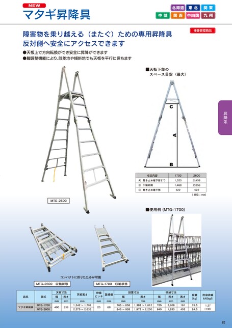 NEWマタギ昇降具北海道東北関東中部関西中四国九州障害物を乗り越える(またぐ)ための専用昇降具反対側へ安全にアクセスできます●天板上で方向転換ができ安全に昇降ができます●脚調整機能により、段差地や傾斜地でも天板を平行に保ちます機番管理商品■天板下部のスペース目安(最大)MTG-2600寸法内容A)開き止め最下部までB)下端内側C)開き止め最下部17001,5251,46852226002,4582,056522(単位:mm)■使用例(MTG-1700)コンパクトに折りたたみが可能MTG-2600収納状態MTG-1700収納状態品名型式マタギ昇降具MTG-1700MTG-2600天板寸法幅mm長さmm400539天板高さmm1,342~1,7022,275~2,635伸縮ピッチ踏桟幅mm20mm60設置寸法幅mm長さmm765~8581,383~1,612845~9381,972~2,200収納寸法長さmm2,1081,633高さmm161453幅mm765845質量(kg)15.524.5許容荷重kN(kgf)1.27(130)82