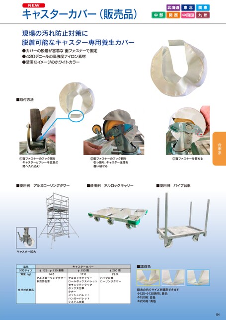 NEWキャスターカバー(販売品)北海道東北関東中部関西中四国九州現場の汚れ防止対策に脱着可能なキャスター専用養生カバー●カバーの脱着が容易な面ファスナーで固定●420デニールの高強度ナイロン素材●清潔なイメージのホワイトカラー■取付方法①面ファスナーのフック側をキャスターとブレーキ金具の間へ入れ込む②面ファスナーのフック側を引っ張り、キャスター全体を覆い被せる③面ファスナーを留める■使用例アルミローリングタワー■使用例アルロックキャリー■使用例パイプ台車キャスター拡大品名対応サイズ質量(g)当社対応商品φ125・φ130兼用14.5アルミローリングタワー多目的台車キャスターカバーφ150用17.0アルロックキャリーロールボックスパレットセキュリティラックボックス台車タナーメッシュパレットハンガーパレットシステム台車■識別色φ200用29.3パイプ台車ローリングタワー縫糸の色でサイズを識別できますΦ125・Φ130兼用:黄色Φ150用:白色Φ200用:青色84