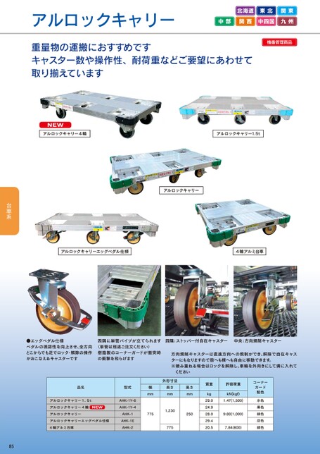 アルロックキャリー北海道東北関東中部関西中四国九州重量物の運搬におすすめですキャスター数や操作性、耐荷重などご要望にあわせて取り揃えています機番管理商品NEWアルロックキャリー4輪アルロックキャリー1.5tアルロックキャリーアルロックキャリーエッグペダル仕様4輪アルミ台車●エッグペダル仕様ペダルの視認性を向上させ、全方向どこからでも足でロック・解除の操作がおこなえるキャスターです四隅に単管パイプが立てられます四隅:ストッパー付自在キャスター中央:方向規制キャスター(単管は別途ご注文ください)樹脂製のコーナーガードが衝突時の衝撃を和らげます方向規制キャスターは直進方向への規制ができ、解除で自在キャスターにもなりますので前へも横へも自由に移動できます。※積み重ねる場合はロックを解除し、車輪を外向きにして溝に入れて品名型式アルロックキャリー1.5tアルロックキャリー4輪NEWアルロックキャリーアルロックキャリーエッグペダル仕様4輪アルミ台車AHK-1Y-6AHK-1Y-4AHK-1AHK-1EAHK-2幅mm775ください外形寸法長さmm1,230775高さmm250質量kg29.024.928.029.420.5許容荷重kN(kgf)1.47(1,500)9.80(1,000)7.84(800)コーナーガード配色水色黒色緑色灰色緑色85
