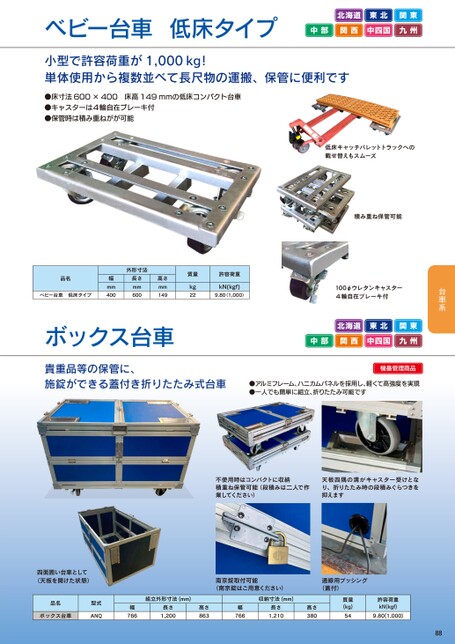 ベビー台車低床タイプ北海道東北関東中部関西中四国九州小型で許容荷重が1,000kg!単体使用から複数並べて長尺物の運搬、保管に便利です●床寸法600×400床高149mmの低床コンパクト台車●キャスターは4輪自在ブレーキ付●保管時は積み重ねがが可能低床キャッチパレットトラックへの載せ替えもスムーズ積み重ね保管可能品名ベビー台車低床タイプ外形寸法長さmm600高さmm149幅mm400質量kg22許容荷重kN(kgf)9.801,000)ボックス台車100φウレタンキャスター4輪自在ブレーキ付北海道東北関東中部関西中四国九州貴重品等の保管に、施錠ができる蓋付き折りたたみ式台車●アルミフレーム、ハニカムパネルを採用し、軽くて高強度を実現●一人でも簡単に組立、折りたたみ可能です機番管理商品不使用時はコンパクトに収納積重ね保管可能(段積みは二人で作業してください)天板四隅の溝がキャスター受けとなり、折りたたみ時の段積みぐらつきを抑えます四面囲い台車として(天板を開けた状態)南京錠取付可能(南京錠はご用意ください)通線用ブッシング(蓋付)品名ボックス台車型式ANQ組立外形寸法(mm)収納寸法(mm)幅766長さ1,200高さ863幅766長さ1,210高さ380質量(kg)54許容荷重kN(kgf)9.80(1,000)88