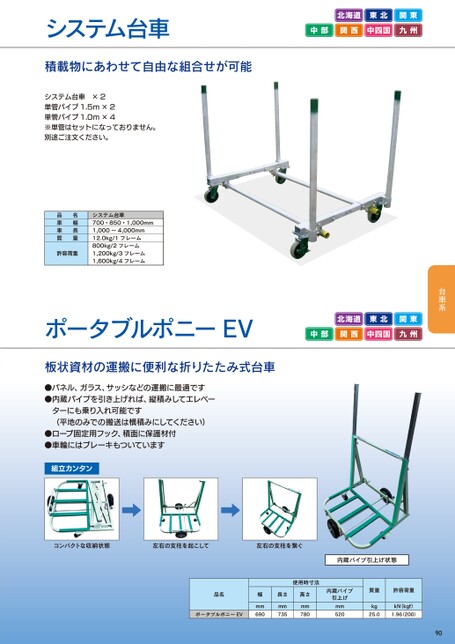 システム台車北海道東北関東中部関西中四国九州積載物にあわせて自由な組合せが可能システム台車×2単管パイプ1.5m×2単管パイプ1.0m×4※単管はセットになっておりません。別途ご注文ください。品名車幅車長質量許容荷重システム台車700・850・1,000mm1,000~4,000mm12.0kg/1フレーム800kg/2フレーム1,200kg/3フレーム1,600kg/4フレームポータブルポニーEV北海道東北関東中部関西中四国九州板状資材の運搬に便利な折りたたみ式台車●パネル、ガラス、サッシなどの運搬に最適です●内蔵パイプを引き上げれば、縦積みしてエレベーターにも乗り入れ可能です(平地のみでの搬送は横積みにしてください)●ロープ固定用フック、積面に保護材付●車輪にはブレーキもついています組立カンタンコンパクトな収納状態左右の支柱を起こして左右の支柱を繋ぐ内蔵パイプ引上げ状態使用時寸法品名ポータブルポニーEV幅mm690長さ高さmm735mm780内蔵パイプ引上げmm520質量許容荷重kg25.0kN(kgf)1.96200)90