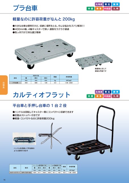 プラ台車北海道東北関東中部関西中四国九州軽量なのに許容荷重がなんと200kg●大きな台車は便利だけど、収納に場所をとる。そんな悩みをズバリ解消!!●400mm幅、4輪キャスターで狭い通路をラクラク通過●取っ手穴付で持ち運び簡単品名プラ台車幅mm400外形寸法長さmm680高さmm128質量kg4.0許容荷重kN(kgf)1.96(200)積載物に応じて連結も可能ですカルティオフラット北海道東北関東中部関西中四国九州平台車と手押し台車の1台2役●ハンドルは回転してキャスター側にコンパクトに収納できます●足踏みストッパー付きです●軽量・コンパクトなのに許容荷重200kgハンドルを収納して平台車のように使用できます品名型式ハンドル使用時寸法高さmm長さmm幅mmハンドル収納時寸法高さmm長さmm幅mmカルティオフラットMPK-720F-BKS52081184252081116291質量許容荷重kg9.8kN(kgf)1.96(200)