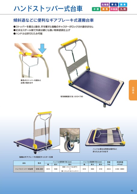 ハンドストッパー式台車北海道東北関東中部関西中四国九州傾斜道などに便利なギアブレーキ式運搬台車●ストッパーを握ると動き、手を離すと後輪のキャスターがロックされ動きません●丈夫なスチール製で外装は錆にも強い粉体塗装仕上げ●ハンドルは折りたたみ可能黄色のストッパーを握ると台車が動きます有効積載面寸法:610×790ハンドル部分は特別な動作なく折りたたみできます後輪はギアブレーキ式固定キャスター仕様品名型式ハンドル使用時寸法(mm)高さ長さ幅ハンドル収納時寸法(mm)幅高さ長さ質量(kg)許容荷重kN(kgf)ハンドストッパー式台車SHB-300610940+61094031023.52.94(300)30(ハンドストッパー)900(ハンドルまで)92