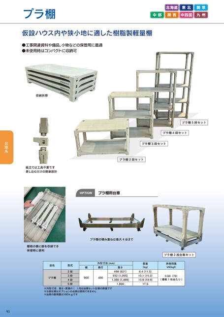 プラ棚北海道東北関東中部関西中四国九州仮設ハウス内や狭小地に適した樹脂製軽量棚●工事関連資料や備品、小物などの保管用に最適●未使用時はコンパクトに収納可収納状態組立ては工具不要です差し込むだけの簡単設計プラ棚5段セットプラ棚4段セットプラ棚3段セットプラ棚2段セットOPTIONプラ棚用台車棚板の裏に脚を収納でき保管時に便利プラ棚の積み重ねは最大4台までプラ棚2段台車セット品名プラ棚型式2段3段4段5段外形寸法(mm)奥行高さ幅900450498(621)932(1,055)1,366(1,489)1,800質量(kg)6.4(11.5)10.1(15.2)13.8(18.9)17.5許容荷重kN(kgf)0.69(70)(棚板1枚あたり)※外形寸法高さ・質量の()内は台車セット仕様の数値です※5段仕様はオプションの台車は使用できません※台車の耐荷重は180kgです93