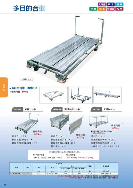 多目的台車北海道東北関東中部関西中四国九州布板セット■多目的台車本体S1・積載荷重800kgOPTION布板セットOPTION箱パネルセットOPTION2段セット積載荷重600kg本体S1×1鋼製布板BKN-6×1鋼製布板BKN-624×1積載荷重600kg本体S1×1鋼製布板BKN-6×3鋼製布板BKN-624×1箱パネル×2積載荷重600kg■上段に積載する荷重は、100kg以下としてください。本体S1×1鋼製布板BKN-6×2鋼製布板BKN-624×22段用ソケットNS-1×2※布板等使用する場合は、布板の積載荷重に準じます。●中央集中荷重BKN-6200kg/BKN-624100kg●等分布荷重BKN-6400kg/BKN-624200kg品名型式多目的台車S-1幅mm873長さmm1,240~1,980高さアーム収納時アーム使用時mm279mm848質量kg51.0許容荷重kN(kgf)7.84(800)※外形寸法※スライド部に荷重をかけないように注意※布板セット・箱パネルセットの許容荷重は600kgです。※オプション各セット(布板・箱パネル・2段)の外形寸法長さは1,980で固定です。95