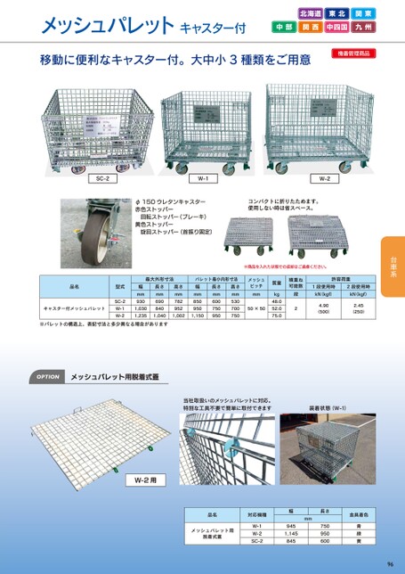 メッシュパレットキャスター付北海道東北関東中部関西中四国九州移動に便利なキャスター付。大中小3種類をご用意機番管理商品SC-2W-1W-2φ150ウレタンキャスター赤色ストッパー回転ストッパー(ブレーキ)黄色ストッパー旋回ストッパー(首振り固定)コンパクトに折りたためます。使用しない時は省スペース。品名キャスター付メッシュパレット型式SC-2W-1W-2幅mm9301,0301,235最大外形寸法長さmm690840高さmm7829521,0401,0021,150パレット最小内形寸法幅mm850長さmm600高さmm530950750950700750※商品を入れた状態での返却はご遠慮ください。メッシュピッチmm50×50質量kg48.052.075.0積重ね可能数段2許容荷重1段使用時kN(kgf)2段使用時kN(kgf)4.90(500)2.45(250)※パレットの構造上、表記寸法と多少異なる場合がありますOPTIONメッシュパレット用脱着式蓋当社取扱いのメッシュパレットに対応。特別な工具不要で簡単に取付できます装着状態(W-1)W-2用品名対応機種メッシュパレット用脱着式蓋W-1W-2SC-2mm幅9451,145845長さ750950600金具着色青緑黄96