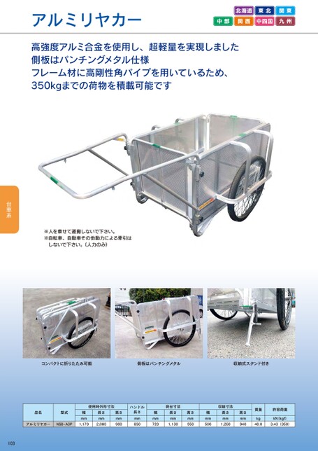 アルミリヤカー北海道東北関東中部関西中四国九州高強度アルミ合金を使用し、超軽量を実現しました側板はパンチングメタル仕様フレーム材に高剛性角パイプを用いているため、350kgまでの荷物を積載可能です※人を乗せて運搬しないで下さい。※自転車、自動車その他動力による牽引はしないで下さい。(人力のみ)コンパクトに折りたたみ可能側板はパンチングメタル収納式スタンド付き使用時外形寸法ハンドル品名型式幅mm長さmmアルミリヤカーNS8-A3P1,1702,080高さmm900長さmm850荷台寸法長さmm1,130幅mm720高さmm550幅mm500収納寸法長さmm1,260高さmm940質量kg40.0許容荷重kN(kgf)3.43(350)103