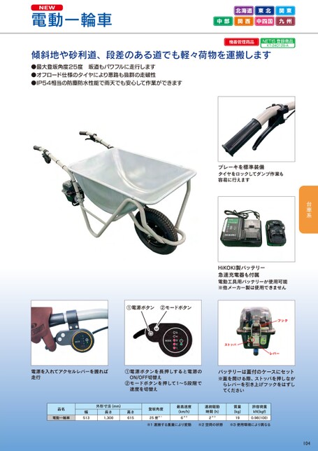 NEW電動一輪車北海道東北関東中部関西中四国九州機番管理商品NETIS登録商品KT-240129-A傾斜地や砂利道、段差のある道でも軽々荷物を運搬します●最大登坂角度25度坂道もパワフルに走行します●オフロード仕様のタイヤにより悪路も抜群の走破性●IP54相当の防塵防水性能で雨天でも安心して作業ができますブレーキを標準装備タイヤをロックしてダンプ作業も容易に行えますHiKOKI製バッテリー急速充電器も付属電動工具用バッテリーが使用可能※他メーカー製は使用できません①電源ボタン②モードボタン電源を入れてアクセルレバーを握れば走行①電源ボタンを長押しすると電源のON/OFF切替え②モードボタンを押して1~5段階で速度を切替えバッテリーは蓋付のケースにセット※蓋を開ける際、ストッパを押しながらレバーを引き上げフックをはずしてください品名電動一輪車外形寸法(mm)幅513長さ1,300高さ615登坂角度25度※1最高速度(km/h)6※2連続駆動時間(h)2※3質量(kg)19許容荷重kN(kgf)0.98(100)※1運搬する重量により変動※2空荷の状態※3使用環境により異なる104