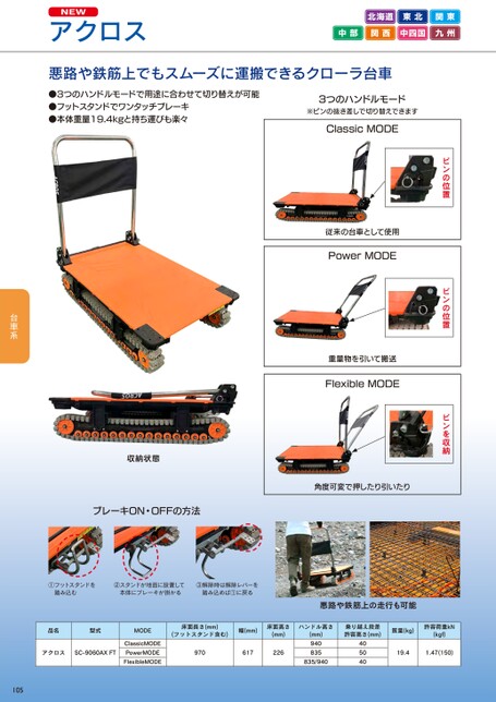 NEWアクロス北海道東北関東中部関西中四国九州悪路や鉄筋上でもスムーズに運搬できるクローラ台車●3つのハンドルモードで用途に合わせて切り替えが可能●フットスタンドでワンタッチブレーキ●本体重量19.4kgと持ち運びも楽々3つのハンドルモード※ピンの抜き差しで切り替えできますClassicMODEピンの位置ピンの位置ピンを収納従来の台車として使用PowerMODE重量物を引いて搬送FlexibleMODE角度可変で押したり引いたり悪路や鉄筋上の走行も可能(mm)940835835/940乗り越え段差許容高さ(mm)質量(kg)許容荷重kN(kgf)40504019.41.47(150)収納状態ブレーキON・OFFの方法①フットスタンドを踏み込む②スタンドが地面に設置して本体にブレーキが掛かる③解除時は解除レバーを踏み込めば①に戻る品名型式MODE床面長さ(mm)(フットスタンド含む)幅(mm)アクロスSC-9060AXFTClassicMODEPowerMODEFlexibleMODE970617226105床面高さハンドル高さ(mm)