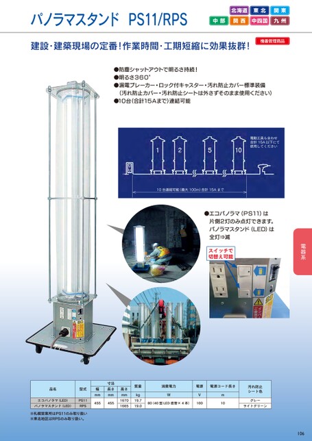 パノラマスタンドPS11/RPS北海道東北関東中部関西中四国九州建設・建築現場の定番!作業時間・工期短縮に効果抜群!機番管理商品●防塵シャットアウトで明るさ持続!●明るさ360°●漏電ブレーカー・ロック付キャスター・汚れ防止カバー標準装備(汚れ防止カバー・汚れ防止シートは外さずそのまま使用ください)●10台(合計15Aまで)連結可能電動工具も合わせ合計15A以下にて使用してください10台連結可能(最大100m)合計15Aまで●エコパノラマ(PS11)は片側2灯のみ点灯できます。パノラマスタンド(LED)は全灯⇒滅スイッチで切替え可能品名エコパノラマ(LED)パノラマスタンド(LED)寸法長さmm幅mm455455高さmm16701665質量kg19.719.0型式PS11RPS消費電力電源電源コード長さWV80(40型LED直管×4本)100m10汚れ防止シート色グレーライトグリーン※札幌営業所はPS11のみ取り扱い※東北地区はRPSのみ取り扱い。106