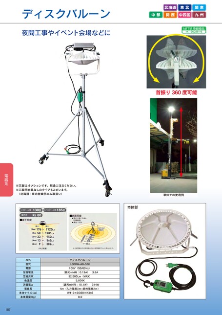 ディスクバルーン夜間工事やイベント会場などに北海道東北関東中部関西中四国九州NETIS登録商品KK-190026-VE首振り360度可能7m※三脚はオプションです、別途ご注文ください。※三脚用金具なしのタイプもございます。(北海道・東北営業部のみ取扱い)単体での使用例本体部品名型式電源定格電流定格光束色温度消費電力電線長本体サイズ(㎜)本体質量(㎏)ディスクバルーンL300W-AB-50K100V(50/60Hz)(調光min時:0.13A)3.6A32,500Lm(MAX)5,000K(調光min時:10.1W)344W5m(入力電源3m+調光電線2m)W410×D368×H3468.0107
