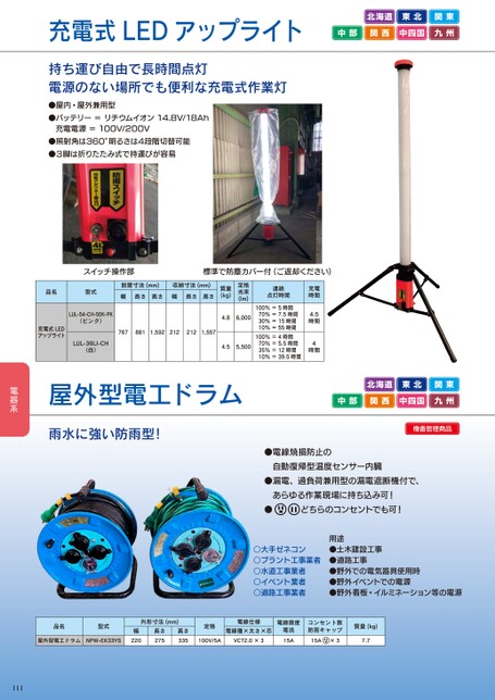 充電式LEDアップライト北海道東北関東中部関西中四国九州北海道東北関東中部関西中四国九州機番管理商品●電線焼損防止の自動復帰型温度センサー内臓●漏電、過負荷兼用型の漏電遮断機付で、あらゆる作業現場に持ち込み可!●どちらのコンセントでも可!○大手ゼネコン○プラント工事業者○水道工事業者○イベント業者○道路工事業者用途●土木建設工事●道路工事●野外での電気器具使用時●野外イベントでの電源●野外看板・イルミネーション等の電源充電時間4.5時間間4時連続点灯時間70%=7.5時間30%=15時間10%=55時間100%=5時間 100%=4時間 70%=5.5時間35%=12時間10%=39.5時間品名型式設置寸法(mm)収納寸法(mm)幅長さ高さ幅長さ高さ充電式LEDアップライトLUL-54-CH-50K-PK(ピンク)LUL-36LI-CH(白)7678811,5922122121,557質量(kg)定格光束(lm)4.86,0004.55,500屋外型電工ドラム雨水に強い防雨型!●照射角は360°明るさは4段階切替可能●3脚は折りたたみ式で持運びが容易スイッチ操作部標準で防塵カバー付(ご返却ください)持ち運び自由で長時間点灯電源のない場所でも便利な充電式作業灯●屋内・屋外兼用型●バッテリー=リチウムイオン14.8V/18Ah充電電源=100V/200V品名型式屋外型電工ドラムNPW-EK33YS外形寸法(mm)幅220長さ275高さ335111電線仕様電線限度定格電線種×太さ×芯100V/5AVCT2.0×3電流15Aコンセント数防雨キャップ質量(kg)15A×37.7
