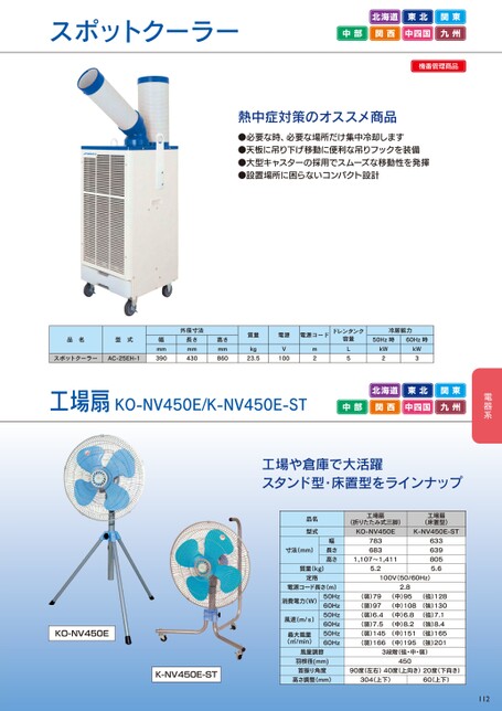 スポットクーラー北海道東北関東中部関西中四国九州機番管理商品熱中症対策のオススメ商品●必要な時、必要な場所だけ集中冷却します●天板に吊り下げ移動に便利な吊りフックを装備●大型キャスターの採用でスムーズな移動性を発揮●設置場所に困らないコンパクト設計品名型式スポットクーラーAC-25EH-1外径寸法長さmm430高さmm860幅mm390質量kg23.5電源電源コードドレンタンク容量冷房能力50Hz時60Hz時V100m2L5kW2kW3工場扇KO-NV450E/K-NV450E-ST北海道東北関東中部関西中四国九州工場や倉庫で大活躍スタンド型・床置型をラインナップ品名型式工場扇(折りたたみ式三脚)工場扇(床置型)KO-NV450EK-NV450E-STKO-NV450EK-NV450E-ST寸法(mm)幅長さ高さ質量(kg)定格消費電力(W)風速(m/s)電源コード長さ(m)50Hz60Hz50Hz60Hz50Hz60Hz最大風量(㎥/min)風量調節羽根径(mm)首振り角度7836831,107~1,4115.26336398055.6100V(50/60Hz)2.8(弱)79(中)95(強)128(弱)97(中)108(強)130(弱)6.4(中)6.8(強)7.1(弱)7.5(中)8.2(強)8.4(弱)145(中)151(強)165(弱)166(中)195(強)2013段階(強・中・弱)45090度(左右)40度(上向き)20度(下向き)高さ調整(mm)304(上下)60(上下)112