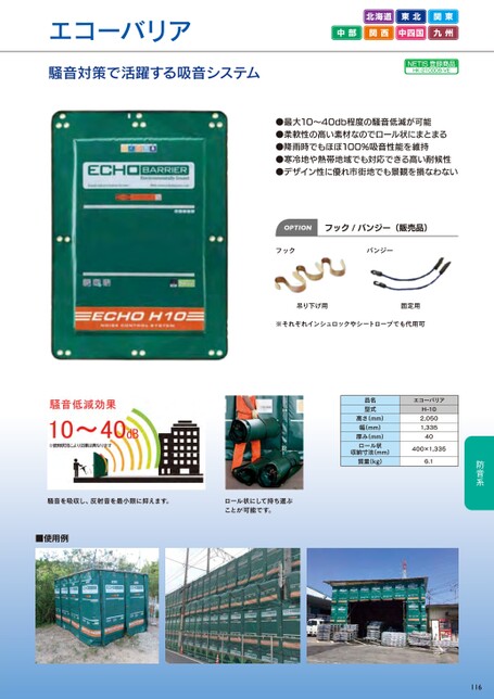 エコーバリア騒音対策で活躍する吸音システム北海道東北関東中部関西中四国九州NETIS登録商品HK-210009-VE●最大10~40db程度の騒音低減が可能●柔軟性の高い素材なのでロール状にまとまる●降雨時でもほぼ100%吸音性能を維持●寒冷地や熱帯地域でも対応できる高い耐候性●デザイン性に優れ市街地でも景観を損なわないOPTIONフック/バンジー(販売品)フックバンジー吊り下げ用固定用※それぞれインシュロックやシートロープでも代用可品名型式高さ(mm)幅(mm)厚み(mm)ロール状収納寸法(mm)質量(kg)エコーバリアH-102,0501,33540400×1,3356.1騒音を吸収し、反射音を最小限に抑えます。ロール状にして持ち運ぶことが可能です。■使用例116
