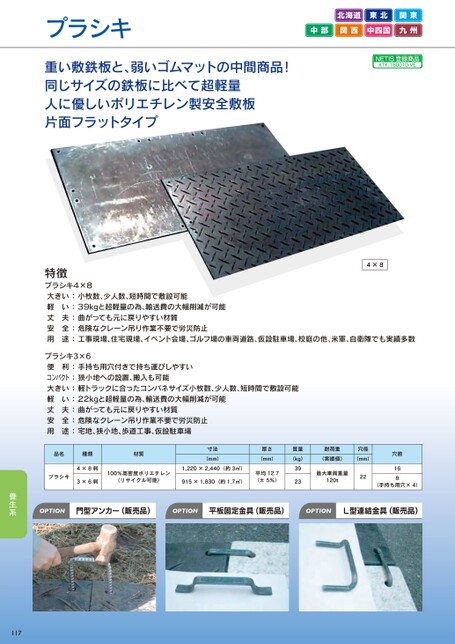 プラシキ重い敷鉄板と、弱いゴムマットの中間商品!同じサイズの鉄板に比べて超軽量人に優しいポリエチレン製安全敷板片面フラットタイプ北海道東北関東中部関西中四国九州NETIS登録商品KTK-160010-VE特徴4×8プラシキ4×8大きい:小枚数、少人数、短時間で敷設可能軽い:39kgと超軽量の為、輸送費の大幅削減が可能丈夫:曲がっても元に戻りやすい材質安全:危険なクレーン吊り作業不要で労災防止用途:工事現場、住宅現場、イベント会場、ゴルフ場の車両道路、仮設駐車場、校庭の他、米軍、自衛隊でも実績多数プラシキ3×6便利:手持ち用穴付きで持ち運びしやすいコンパクト:狭小地への設置、搬入も可能大きい:軽トラックに合ったコンパネサイズ小枚数、少人数、短時間で敷設可能軽い:22kgと超軽量の為、輸送費の大幅削減が可能丈夫:曲がっても元に戻りやすい材質安全:危険なクレーン吊り作業不要で労災防止用途:宅地、狭小地、歩道工事、仮設駐車場品名種類材質寸法(mm)厚さ質量耐荷重穴径(mm)(kg)(実績値)(mm)プラシキ4×8判3×6判100%高密度ポリエチレン(リサイクル可能)1,220×2,440(約3㎡)915×1,830(約1.7㎡)平均12.7(±5%)3923最大車両重量120t22穴数168(手持ち用穴×4)OPTION門型アンカー(販売品)OPTION平板固定金具(販売品)OPTIONL型連結金具(販売品)117