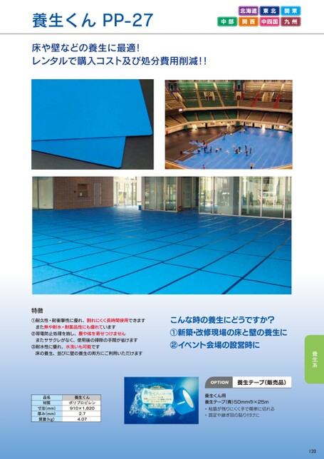 養生くんPP-27北海道東北関東中部関西中四国九州床や壁などの養生に最適!レンタルで購入コスト及び処分費用削減!!特徴①耐久性・耐衝撃性に優れ、割れにくく長時間使用できますまた熱や耐水・耐薬品性にも優れています②帯電防止処理を施し、塵や埃を寄せつけませんまたササクレがなく、使用後の掃除の手間が省けます③耐水性に優れ、水洗いも可能です床の養生、並びに壁の養生の両方にご利用いただけますこんな時の養生にどうですか?①新築・改修現場の床と壁の養生に②イベント会場の設営時にOPTION養生テープ(販売品)品名材質寸法(mm)厚み(mm)質量(kg)養生くんポリプロピレン910×1,8202.74.07養生くん用養生テープ(青)50mm巾×25m・・粘着が残りにくく手で簡単に切れる固定や継ぎ目の貼り付けに120