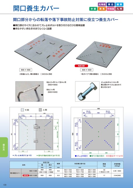 開口養生カバー北海道東北関東中部関西中四国九州開口部分からの転落や落下事故防止対策に役立つ養生カバー●開口部のサイズに合わせてズレ止めボルトを取り付けるだけの簡単設置●持ちやすい持ち手付きでらくらく設置900×900NEW600×6002枚組により、開口部最大□800に対応1枚タイプで開口部最大□500に対応1枚に2ヶ所ついて計4ヶ所(900×900)1枚に1ヶ所(600×600)ズレ止めボルト×4ヶ所開口部のサイズにあわせて取り付けます品名開口養生カバー900×900外形寸法幅mm900長さmm900(450×9002枚組)NEW600×600600600板厚mm9.06.0対応開口部寸法mm550×550・600×600・650×650700×700・750×750・800×800250×250・300×300・350×350400×400・450×450・500×500質量(kg)58(1枚あたり29)許容荷重kN(kgf)4.90(500)172.94(300)123