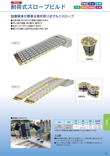 NEW耐荷式スロープビルド北海道東北関東中部関西中四国九州設置解体が簡単な巻き取り式アルミスロープ●工具不要、広げるだけで簡単に設置できます●アルミ製で軽量、持ち運びに便利です●丸めてコンパクトに収納ができます●緩やかな傾斜、山型や凹凸の道に対応します1本タイプ2本タイプ■使用例(1本タイプ)収納状態収納状態品名型式耐荷式スロープビルド1本タイプ2本タイプ全長mm2,110全幅mm784327(1本)質量kg23.013.5許容荷重kN(kgf)4.41(450)8.82(900)※2本タイプ使用の際、荷重が2本均等にかかるよう使用してください注意●解体設置の際は、軍手などを着用しレール板の間に指をはさんだり、ひっかけたりしないようご注意ください。●スロープを広げる際に、安全カバーをレール板の間にはさまないよう気を付けてください。124