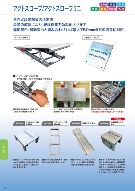 アクトスロープ/アクトスロープミニ北海道東北関東中部関西中四国九州自在式段差踏板の決定版段差の解消により、現場作業を効率化させます専用架台、補助架台と組み合わせれば最大750mmまでの段差に対応アクトスロープアクトスロープミニ■アクトスロープの特徴(アクトスロープミニにはありません)段差調整は有効幅内で自由自在工具不要で微調整できますスチール材で45kg(自重)の軽量設計。運搬時に便利な取っ手付き折畳み可能で持ち運びが便利※折り畳んだ状態では使用しないでください。OPTIONアクトスロープ用専用架台OPTIONアクトスロープ用補助架台OPTION配線またぎ架台OPTIONNEW伸縮配管またぎ架台架台にスロープ本体を乗せる場合は3台必要です。架台を側面ピンで連結し、差込ピンを使って本体を固定します。補助架台を組み合わせて、最大750mmの段差を解消します。架台とアクトスロープミニ2台で1セットです。並列に連結可能。工具不要で簡単に設置できます。配管サイズ最大Φ300をまたぐ架台です。脚材の高さが4段階調節できます。アクトスロープと専用架台のセット(段差対応範囲300~450mm)と組み合わせ、配管またぎスロープとして使用できます。129