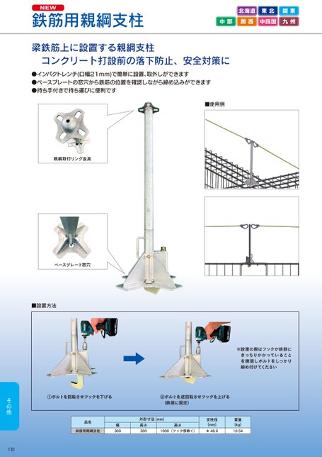 NEW鉄筋用親綱支柱北海道東北関東中部関西中四国九州梁鉄筋上に設置する親綱支柱コンクリート打設前の落下防止、安全対策に●インパクトレンチ(口幅21mm)で簡単に設置、取外しができます●ベースプレートの窓穴から鉄筋の位置を確認しながら締め込みができます●持ち手付きで持ち運びに便利です■使用例親綱取付リング金具ベースプレート窓穴■設置方法※設置の際はフックが鉄筋にきっちりかかっていることを確認しボルトをしっかり締め付けてください①ボルトを回転させフックを下げる②ボルトを逆回転させフックを上げる(鉄筋に固定)品名鉄筋用親綱支柱幅300131外形寸法(mm)長さ300高さ1000(フック部除く)支柱径(mm)Φ48.6質量(kg)10.54